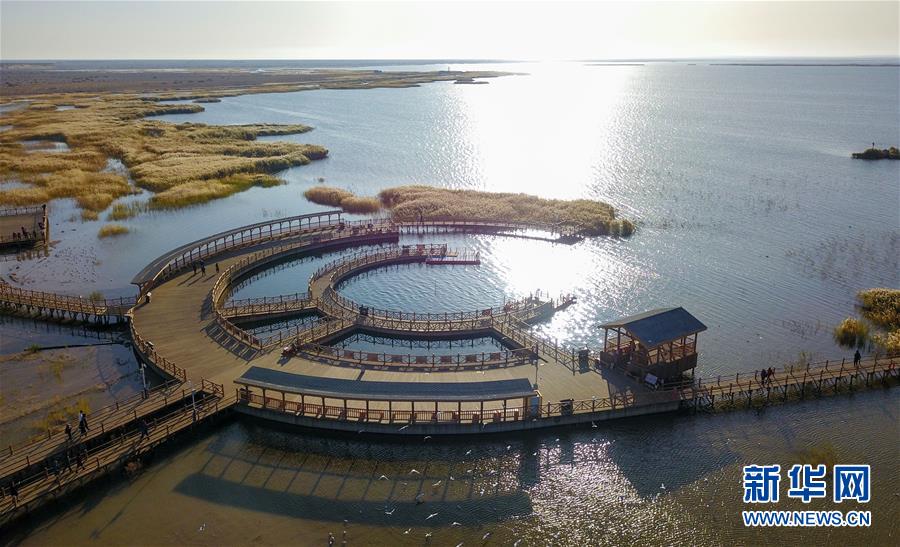 10月17日,游客在居延海岸邊的木棧道上觀賞水鳥(niǎo)。新華社記者 彭源 攝