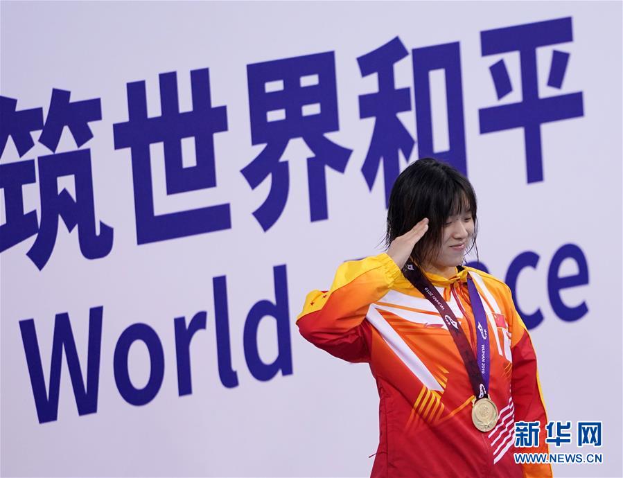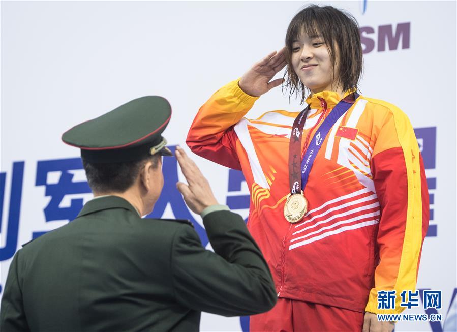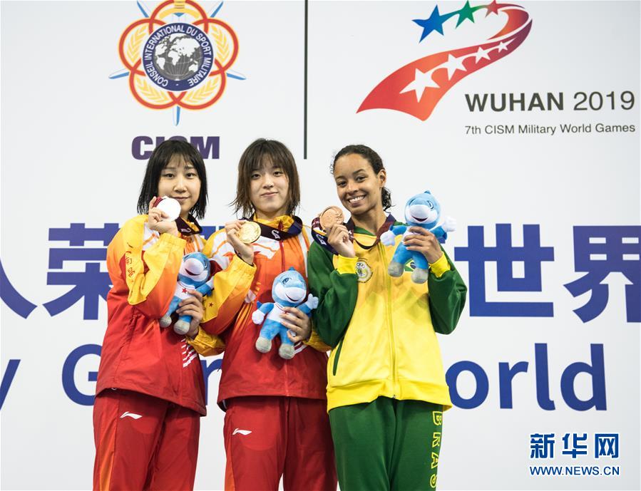 10月20日,中國隊(duì)選手吳慧敏(右)、包雪怡在升旗儀式上。當(dāng)日,在武漢舉行的第七屆世界軍人運(yùn)動(dòng)會(huì)水上救生項(xiàng)目女子50米假人救生決賽中,中國隊(duì)選手吳慧敏以33秒93的成績奪得冠軍,隊(duì)友包雪怡以35秒79的成績獲得亞軍。新華社記者肖藝九攝