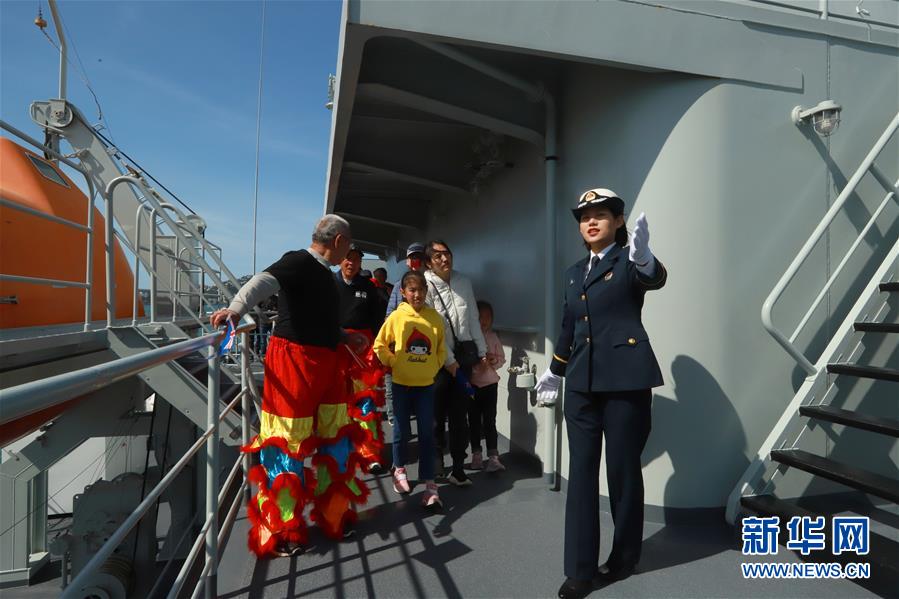 10月26日,在新西蘭首都惠靈頓,中國(guó)海軍訓(xùn)練艦戚繼光艦的學(xué)員為參觀群眾進(jìn)行講解。新華社發(fā)(張雪山攝)