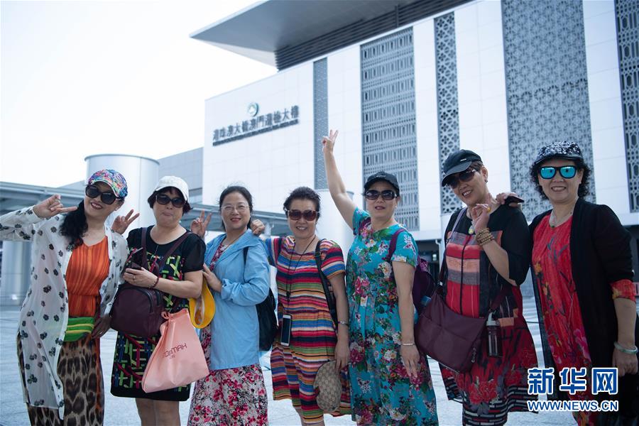 10月24日上午,旅客在港珠澳大橋澳門(mén)邊檢大樓附近合影。2018年10月23日,港珠澳大橋正式開(kāi)通。新華社記者張金加攝