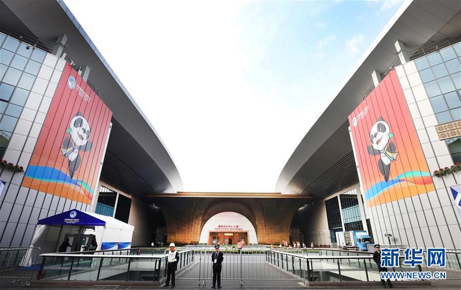 10月25日,位于國展中心內(nèi)的國家會議中心入口處張貼了醒目的進(jìn)博會吉祥物熊貓進(jìn)寶裝飾。  新華社記者 方喆攝