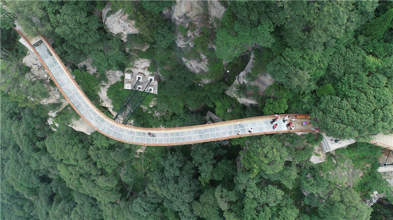2018年6月23日,陜西渭南,游客們?cè)谏偃A山懸空玻璃棧道上游覽拍照。航拍少華山懸空玻璃棧道,下面就是懸崖密林。王警/視覺(jué)中國(guó)