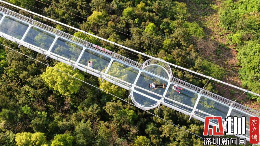 2019年4月24日,湖南張家界大峽谷玻璃橋上,游客們擺出各種姿勢(shì)拍照。剛開(kāi)始,游客們?cè)诙虝旱目謶种螅S之而來(lái)的是滿滿的興奮,男女老少紛紛在這座懸在300多米高空中的全透明玻璃橋上不停拍照,從一開(kāi)始走上橋緊張的不敢踩在玻璃上,到最后在玻璃橋上的各種躺和趴,各種姿勢(shì)各種創(chuàng)意各種拍攝,游客們完全忘我地開(kāi)心游玩。張家界大峽谷玻璃橋,是世界首座斜拉式高山峽谷玻璃橋,玻璃橋全長(zhǎng)430米,寬6米,橋身距離谷底垂直落差300米,大橋表面由99塊透明玻璃鋪設(shè)而成,整個(gè)工程無(wú)鋼筋混凝土橋墩。