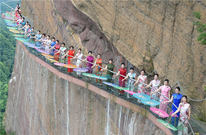 2017年7月1日,江西省弋陽(yáng)國(guó)家級(jí)龜峰5A景區(qū)舉行了一場(chǎng)旗袍秀。艾世民/視覺(jué)中國(guó)