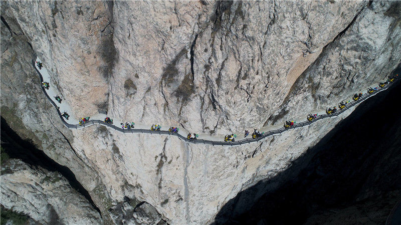 2018年4月3日,河南洛陽(yáng),志愿者在千米懸崖棧道上“飛檐走壁”,騎共享電車呼吁環(huán)保。DF/視覺(jué)中國(guó)