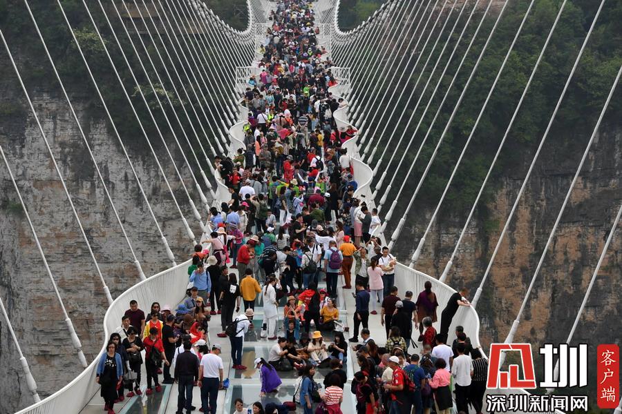 2018年10月4日,游客正在參觀湖南省湘西土家族苗族自治州吉首市矮寨景區(qū)懸崖棧道。劉振軍/視覺(jué)中國(guó)