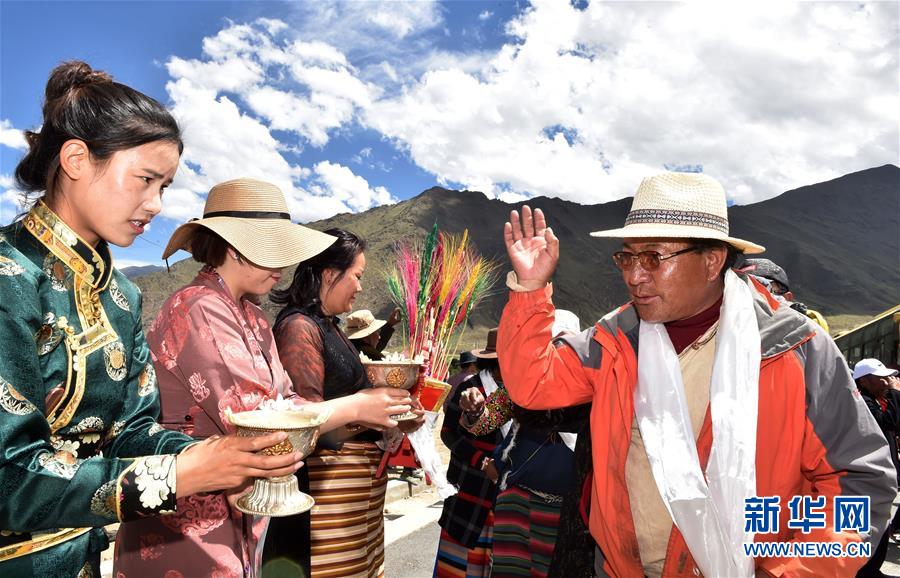 向來自遠(yuǎn)方的新鄰居敬獻(xiàn)青稞酒(2018年6月18日攝)。經(jīng)過兩天的馳騁,11輛大巴和31輛大貨車緩緩駛?cè)肜_市堆龍德慶區(qū)古榮鄉(xiāng)嘎沖村,標(biāo)志著西藏首個高海拔生態(tài)搬遷項(xiàng)目正式實(shí)施。新華社記者覺果攝
