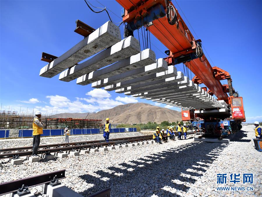 6月6日,負(fù)責(zé)鋪軌的中鐵十一局集團(tuán)的建設(shè)者在現(xiàn)場作業(yè)。新華社記者覺果攝