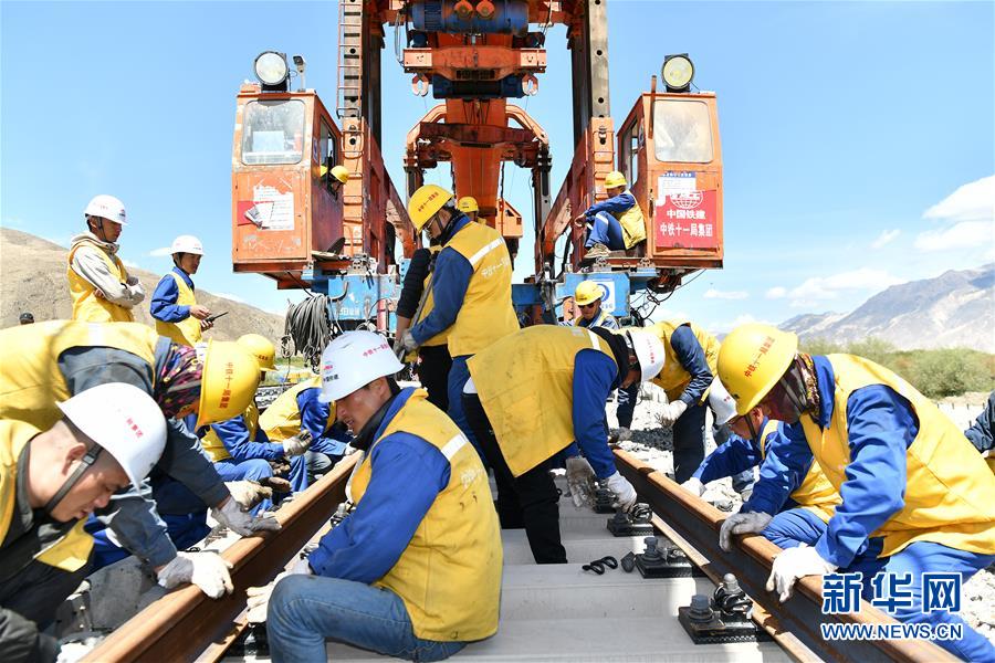 6月6日,負責鋪軌的中鐵十一局集團的建設者在現(xiàn)場作業(yè)。新華社記者李鑫攝