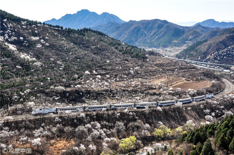 2019年3月22日,北京居庸關(guān)附近的山花盛開,S2線列車穿行在花海之中,構(gòu)成一幅美麗的畫面。時永平/千龍圖像/視覺中國編輯/陳進(jìn)
