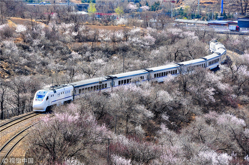 2019年3月22日,北京居庸關(guān)附近的山花盛開,S2線列車穿行在花海之中,構(gòu)成一幅美麗的畫面。