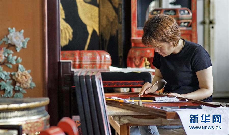 北京金漆鑲嵌有限責(zé)任公司技師在創(chuàng)作漆畫(10月31日攝)。新華社記者李欣攝