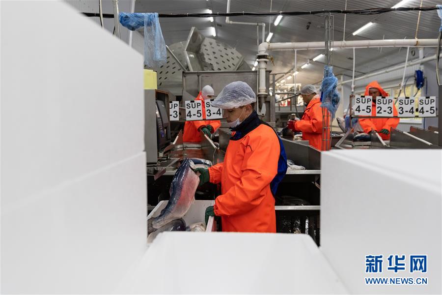9月13日,在俄羅斯摩爾曼斯克,俄羅斯水產(chǎn)養(yǎng)殖公司工作人員在車間處理鮭魚(yú)。 新華社記者白雪騏攝