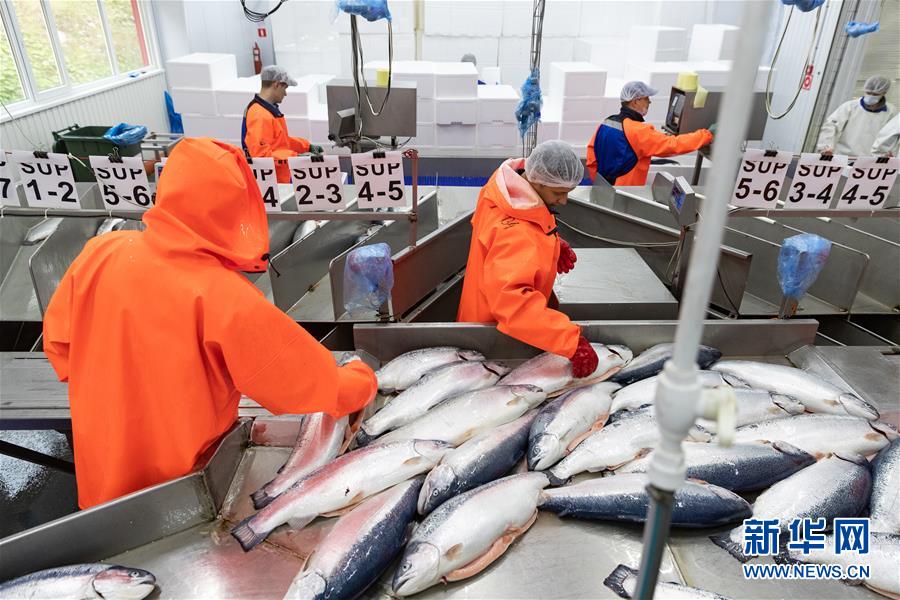 9月13日,在俄羅斯摩爾曼斯克,俄羅斯水產(chǎn)養(yǎng)殖公司工作人員在車間處理鮭魚。  新華社記者白雪騏攝