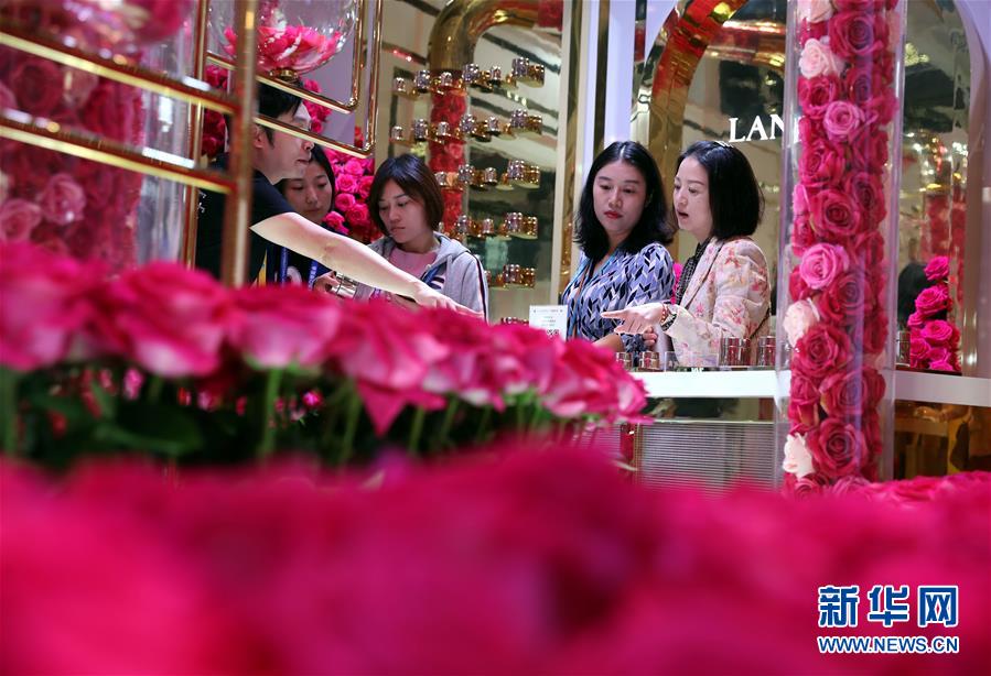 參觀者在第二屆進(jìn)博會(huì)品質(zhì)生活展區(qū)一家化妝品展臺(tái)參觀(11月6日攝)。新華社記者劉穎攝