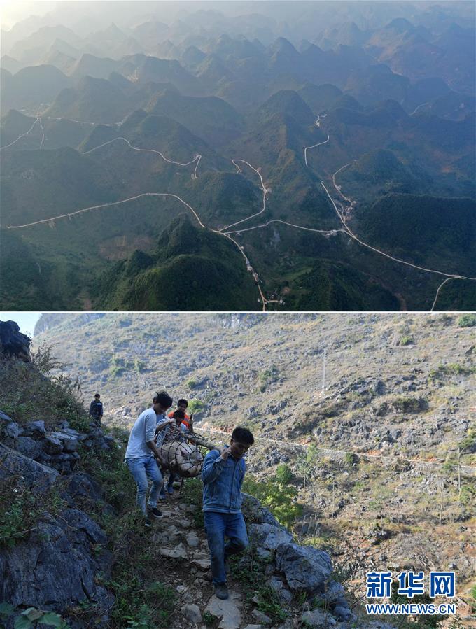 拼版照片:上圖為已經(jīng)通路的大化瑤族自治縣七百弄鄉(xiāng)弄雄村弄桃屯以及周邊村屯(11月10日無人機(jī)拍攝);下圖為在尚未通路的弄雄村弄桃屯,村民抬著準(zhǔn)備出售的土豬走在山路上(2016年12月8日攝)。新華社記者 黃孝邦 攝