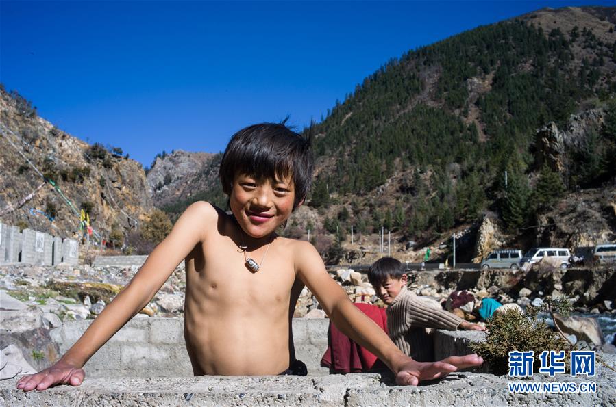 在318國(guó)道邊的四川巴塘縣德達(dá)溫泉,小朋友在沐?。?0月18日攝)。新華社記者江宏景攝