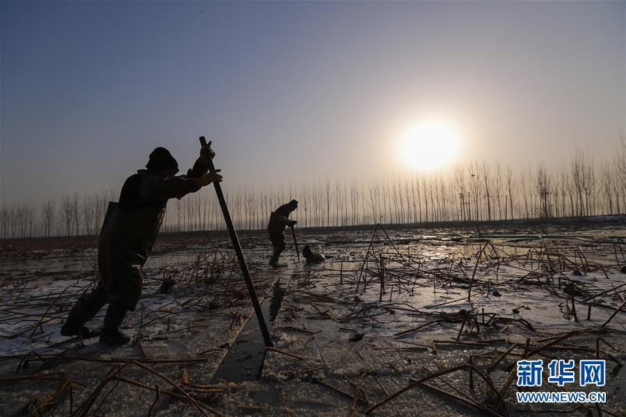 2月1日,在雄安新區(qū)安新縣東向陽村的一處藕塘,挖藕工將塘面結(jié)的冰用電鋸切成小塊后挪開。新華社記者沈伯韓攝