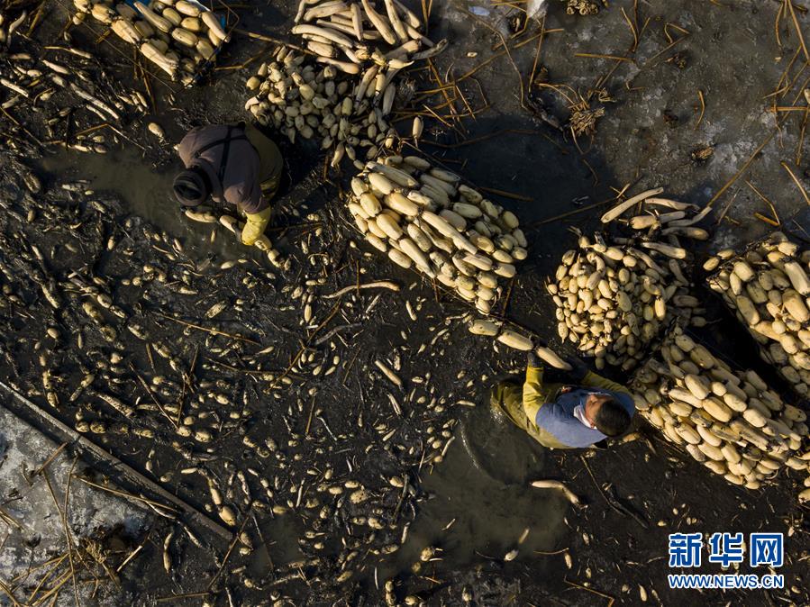1月31日,在雄安新區(qū)安新縣東向陽(yáng)村的一處藕塘,挖藕工清洗挖出來(lái)的藕(無(wú)人機(jī)航拍)。新華社記者沈伯韓攝