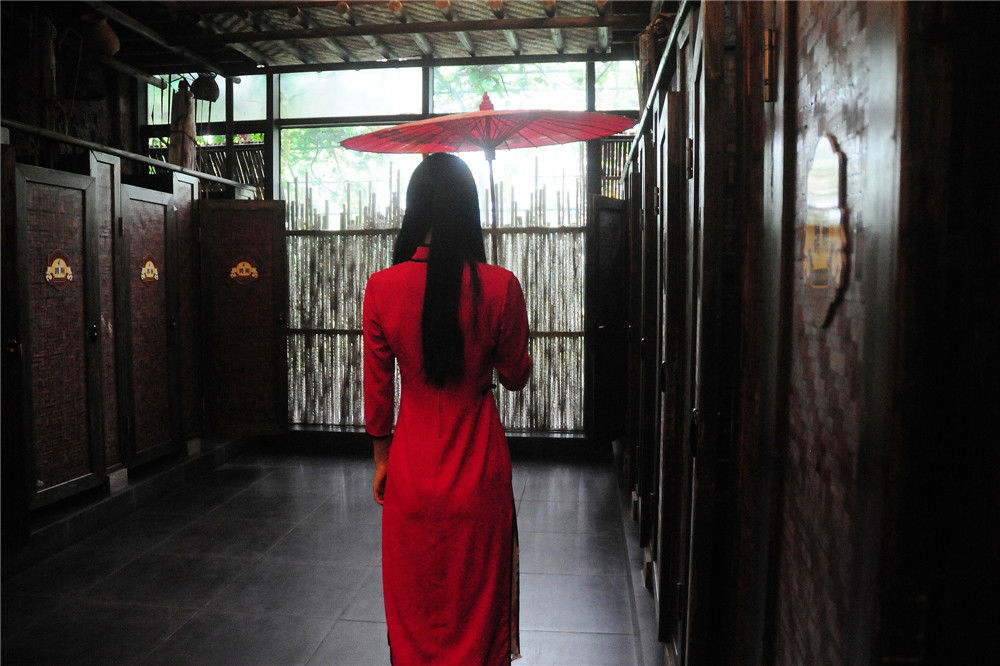 2016年09月29日,杭州,在女廁所,里面也是機關(guān)重重,讓許多游客不敢進去,里面還有人扮演紅衣女鬼,撐著紅傘時不時在廁所里面走動,或者你上廁所的時候突然給你遞紙巾。益鵬/視覺中國