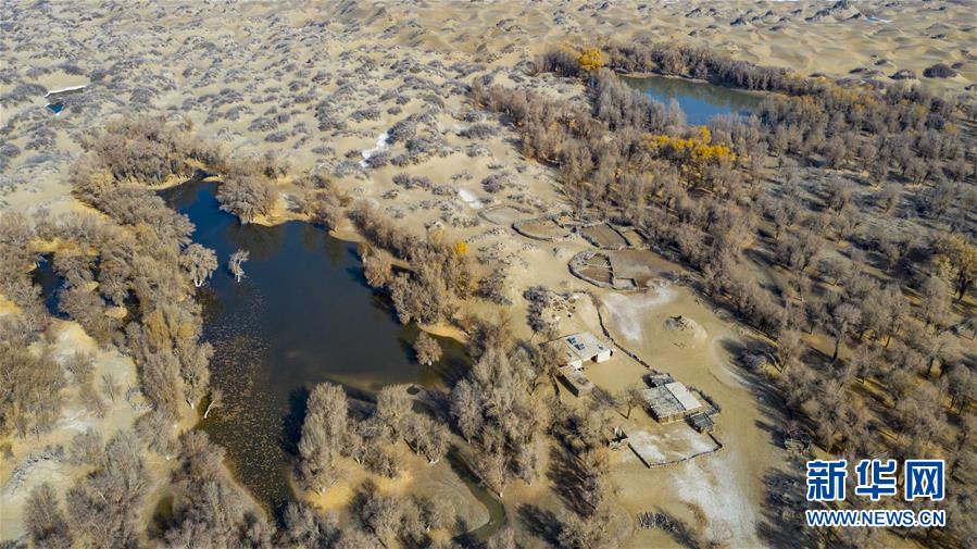 這是位于克里雅河尾閭的民居及胡楊林(11月16日無人機(jī)拍攝)。 新華社記者 胡虎虎 攝