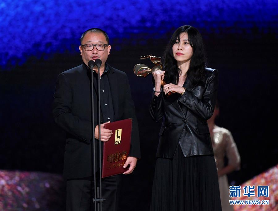 11月23日,電影《地久天長》獲得最佳編劇獎,導演兼編劇王小帥(左)、編劇阿美在頒獎儀式上。當日,第32屆中國電影金雞獎頒獎典禮在福建廈門舉行。新華社記者姜克紅攝