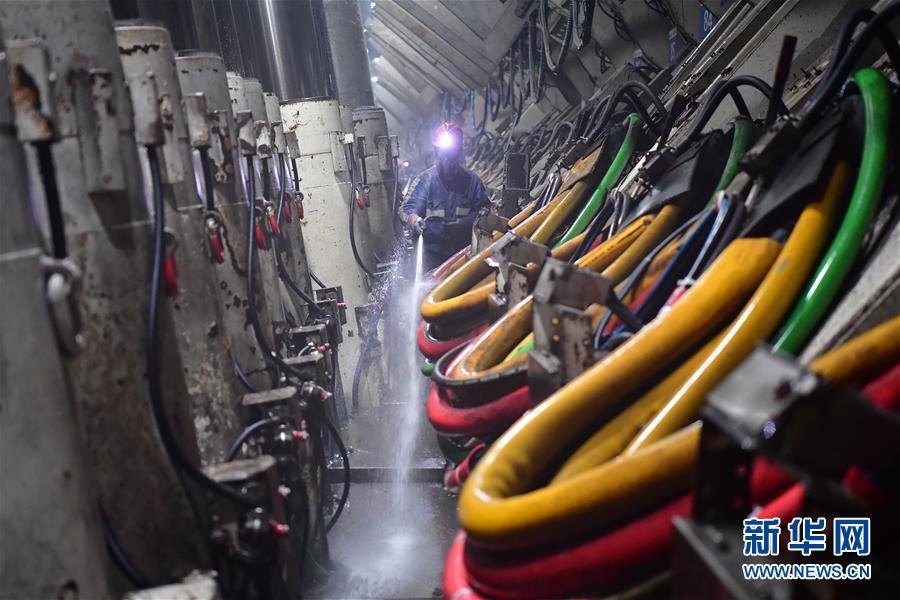 11月26日,在上灣煤礦12402綜采面內(nèi),工作人員對液壓支架區(qū)域進(jìn)行沖洗清潔。 新華社記者 邵瑞 攝