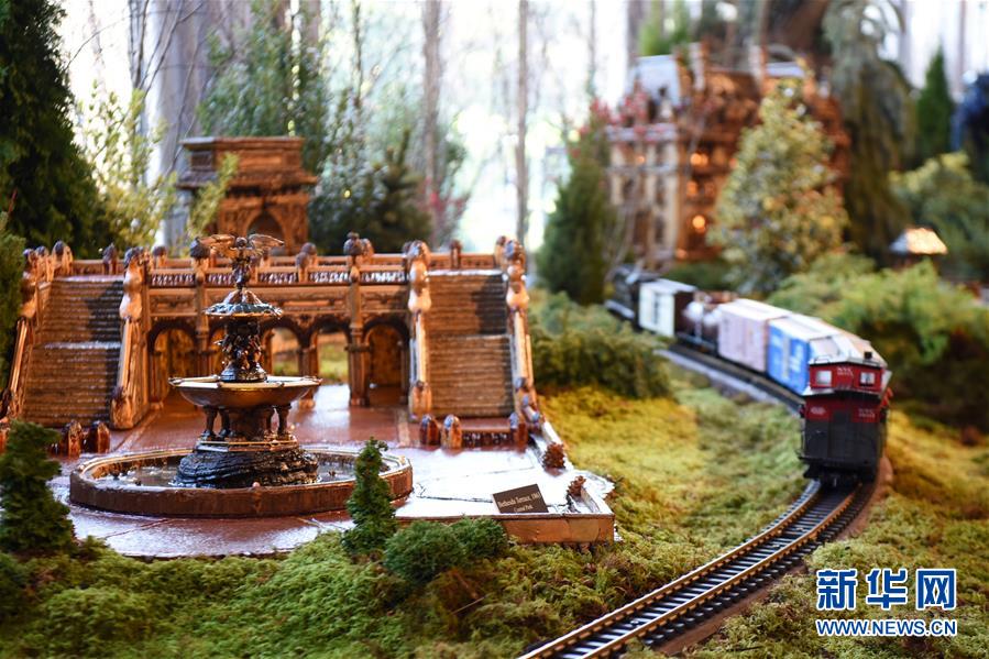11月26日,在美國紐約植物園節(jié)日小火車展上,一輛模型小火車駛過紐約中央公園貝塞斯達(dá)噴泉和臺階微縮模型。新華社記者韓芳攝