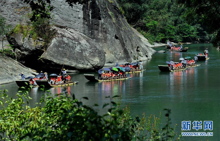 8月23日,游客在武夷山九曲溪乘竹筏游覽。新華社記者張國俊攝