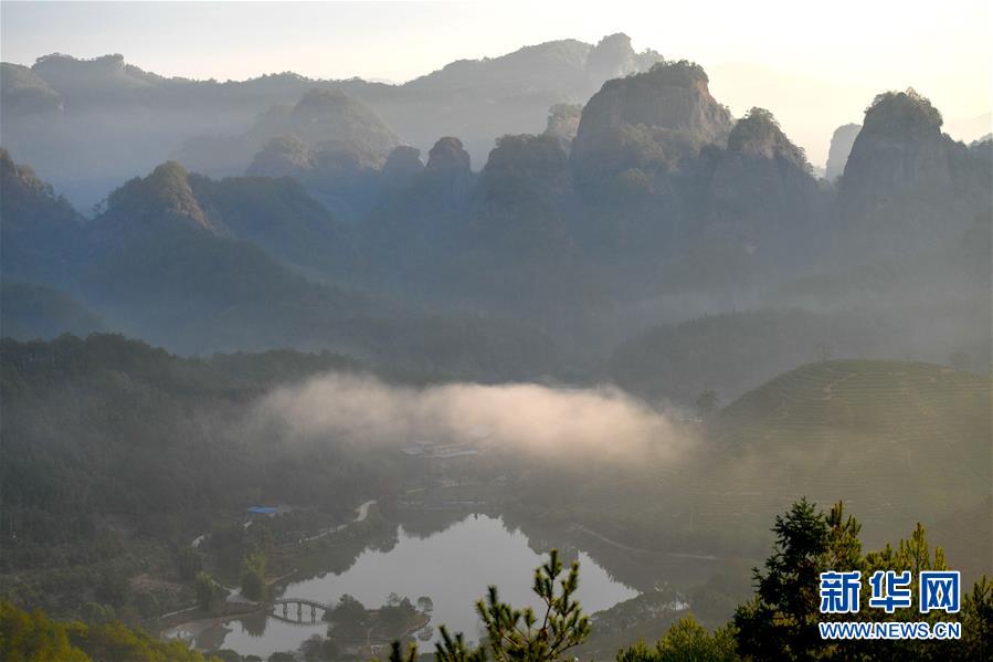 這是福建省武夷山的山水田園風(fēng)光(11月17日無人機拍攝)。初冬時節(jié),福建省武夷山綠意依舊,茶園、山巒、村落在朝霞的映襯下美不勝收,呈現(xiàn)出一派怡然秀麗的山水田園風(fēng)光。新華社記者宋為偉攝