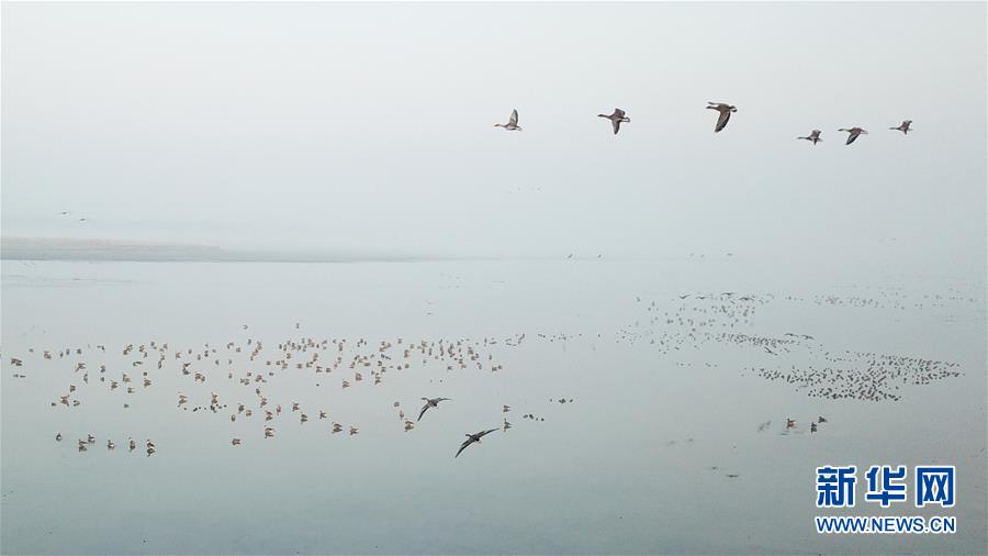 12月7日,候鳥在升金湖上空飛翔(無人機(jī)拍攝)。新華社記者張端攝