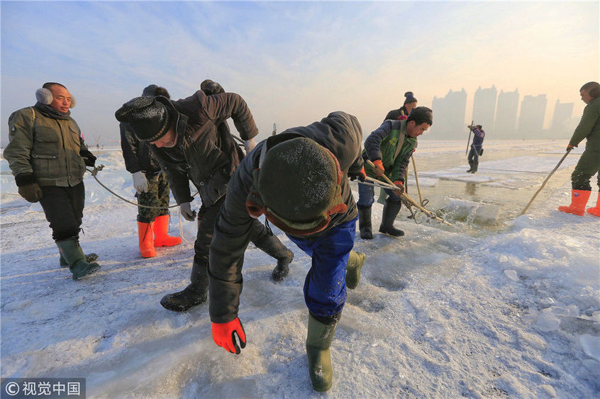 2018年12月11日,黑龍江省哈爾濱市,松花江上,采冰者們彎腰拉繩,宛如纖夫般拽重達半噸的冰塊出水。采冰者都是自哈市江北萬寶、東發(fā)、沙陀子等鄉(xiāng)鎮(zhèn)的農(nóng)民,他們每年冬閑時都會親屬、村鄰之間結(jié)伴到松花江畔采冰,有的采冰人,已經(jīng)連續(xù)干了二十多年。每個采冰季,他們每天要在冰面上工作10-12個小時,每個采冰組,一天要拽出冰塊2000-3000塊,一個近20天的采冰季,每人能收入近萬元。