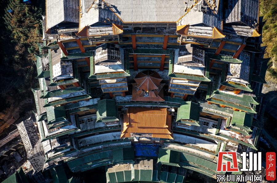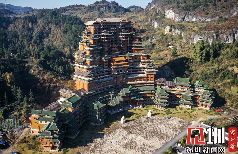 2019年12月8日,貴州省黔南布衣族自治州。位于獨(dú)山縣影山鎮(zhèn)凈心谷的水司府堂占地面積5900平方米,總建筑面積60000平方米,共24層,高99米,進(jìn)深240米,是世界上最高最大最壯觀的水族建筑,被稱為“天下第一水司樓”。