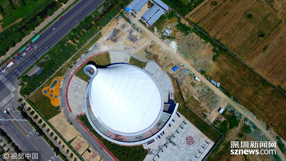 2018年6月13日,航拍河南淮陽一座即將竣工落成的體育場館建筑,市民稱酷似一個(gè)石磨盤。