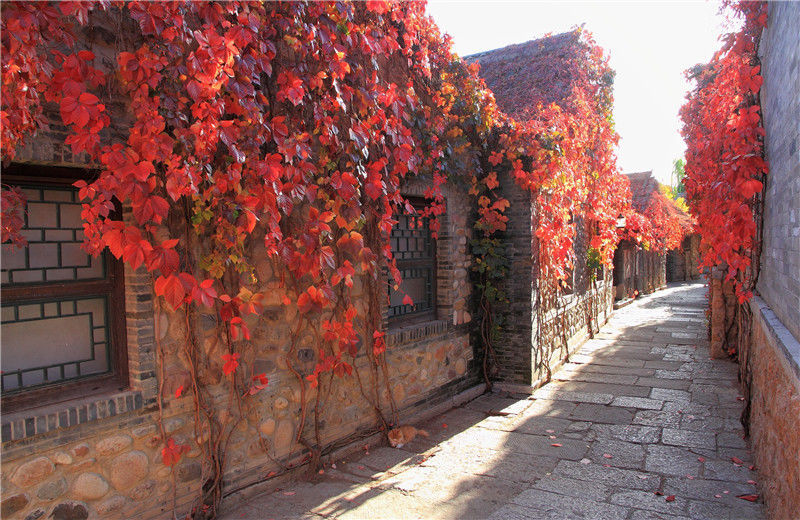 2019年10月30日,北京,古北水鎮(zhèn)秋色正濃,隨處可見的爬山虎蔓莖縱橫,葉子正紅,將水鎮(zhèn)變成了紅葉小鎮(zhèn),美如畫卷。