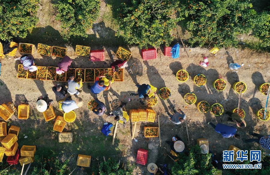 12月11日,廣西柳州市鹿寨縣四排鎮(zhèn)四排村村民在果園里將砂糖橘裝箱(無人機(jī)拍攝)。