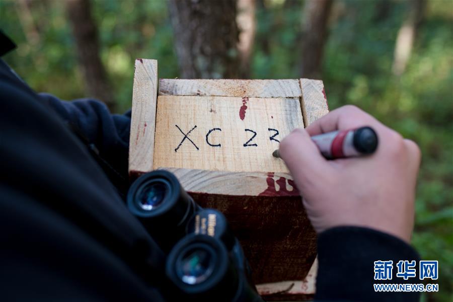 羅康在新做好的人工鳥巢底部寫下編號(12月12日攝)。  新華社記者 胡超 攝