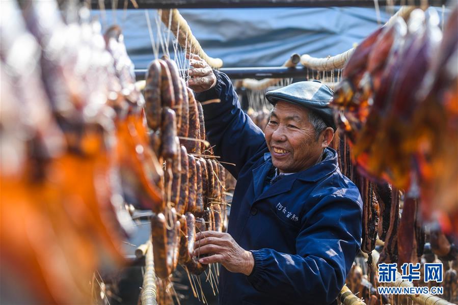 12月3日,安昌古鎮(zhèn)一家名為阿紅香腸的傳統(tǒng)臘味作坊里的工作人員在晾曬各種手工制作的紹興臘味。新華社記者徐昱攝