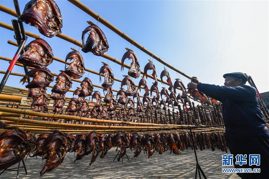 12月3日,安昌古鎮(zhèn)一家名為阿紅香腸的傳統臘味作坊里的工作人員在晾曬各種手工制作的紹興臘味。新華社記者徐昱攝