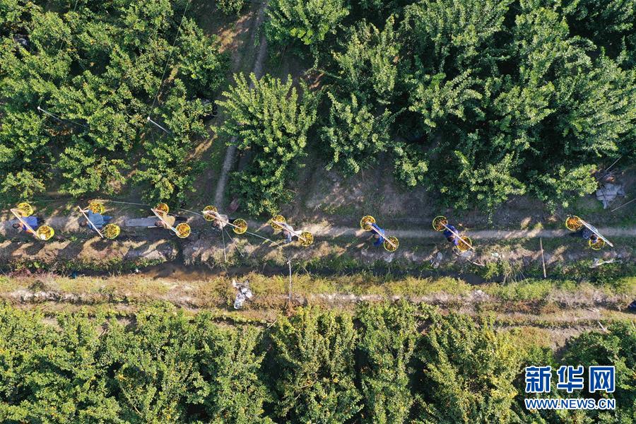 在廣西柳州市鹿寨縣四排鎮(zhèn),村民在果園里采收柑橘(12月11日無人機拍攝)。部分柑橘通過李柳萍的電商平臺外銷。新華社記者黃孝邦攝
