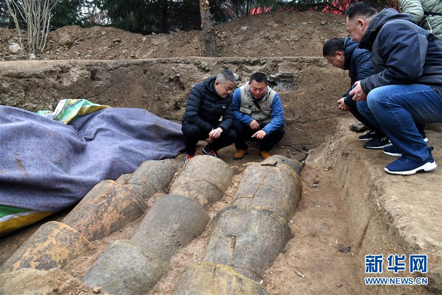 考古隊員(左二)在瑯琊臺遺址考古發(fā)掘現(xiàn)場介紹陶水管的構造和結構(12月21日攝)。新華社記者李紫恒攝