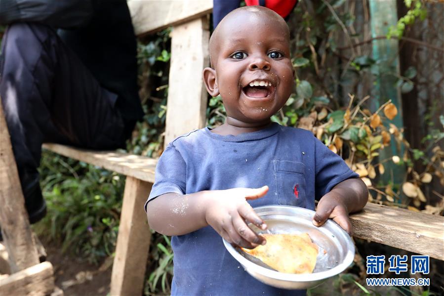 2019年9月1日,在肯尼亞內(nèi)羅畢的一個(gè)街邊攤位,一名兒童品嘗薩摩薩??夏醽喖皷|非地區(qū)的傳統(tǒng)面食薩摩薩是一種三角形的油酥點(diǎn)心,由薄面皮包裹豆類(lèi)、蔬菜及牛羊肉餡后,下鍋油炸而成。 新華社記者 王騰 攝