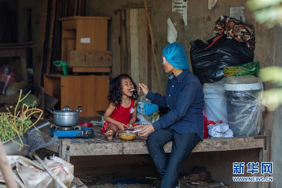 2019年3月15日,在柬埔寨磅湛,接受了白內(nèi)障手術(shù)的孫美樂(lè)回到住處給女兒喂飯。今年36歲的孫美樂(lè)是一位經(jīng)濟(jì)貧困的單身母親,和小女兒租住在一間簡(jiǎn)陋的小屋里。她的左眼因白內(nèi)障幾近失明,無(wú)法繼續(xù)工作。在中國(guó)醫(yī)生到磅湛開(kāi)展義診期間,她接受了廣西醫(yī)科大學(xué)第一附屬醫(yī)院梁皓醫(yī)生實(shí)施的白內(nèi)障手術(shù),術(shù)后一天她的左眼即恢復(fù)視物。 新華社記者 朱煒 攝