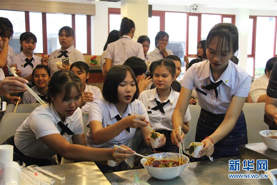 2019年8月30日,在泰國(guó)孔敬大學(xué)孔子學(xué)院,學(xué)生在孔敬大學(xué)第三屆“中國(guó)廚房”美食文化節(jié)上品嘗水煮肉片。 新華社記者 楊舟 攝