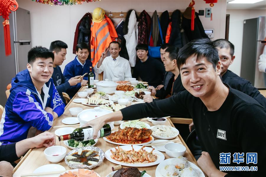 2019年2月5日,在比利時(shí)安特衛(wèi)普港,船員們?cè)凇爸羞h(yuǎn)海運(yùn)天秤座”號(hào)餐廳里共享遲來(lái)的年夜飯。由于駛離漢堡港的時(shí)間出現(xiàn)延誤,超大型集裝箱船“中遠(yuǎn)海運(yùn)天秤座”號(hào)在2月5日農(nóng)歷正月初一凌晨?jī)牲c(diǎn)才抵達(dá)安特衛(wèi)普港,遠(yuǎn)洋海員們終于可以開(kāi)懷暢飲,歡喜過(guò)年。 新華社記者 張鋮 攝