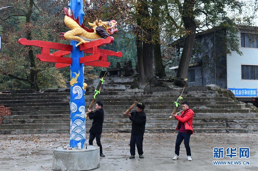 在烏英苗寨新蘆笙柱下,融水苗族自治縣苗族蘆笙音樂代表性傳承人梁安合(中)在練習(xí)吹蘆笙(12月24日攝)。新華社記者王諾攝