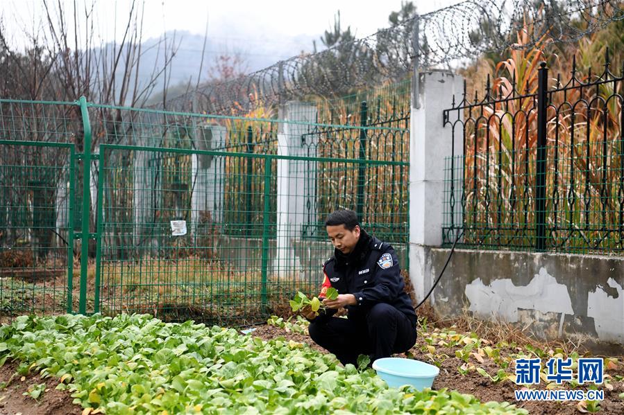 12月18日,常曉龍?jiān)诓藞@摘菜。警務(wù)室位于深山,平時(shí)買(mǎi)菜不方便,常曉龍?jiān)隈v地院子里開(kāi)墾了一片小菜園。新華社記者劉軍喜攝