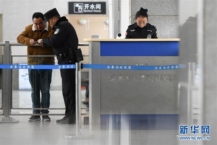 金寨火車(chē)站派出所民警劉偉(中)在候車(chē)大廳為旅客提供出行咨詢(xún)(12月19日攝)。新華社記者張端攝