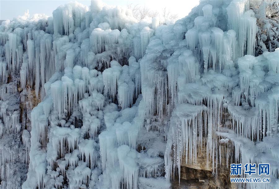 這是平山縣沕沕水景區(qū)的冰瀑(12月25日無人機攝)。近日,河北省平山縣境內(nèi)的沕沕水景區(qū)出現(xiàn)冰瀑美景,形態(tài)各異的冰柱懸掛在山麓間,吸引游客前來觀賞。新華社記者楊世堯攝