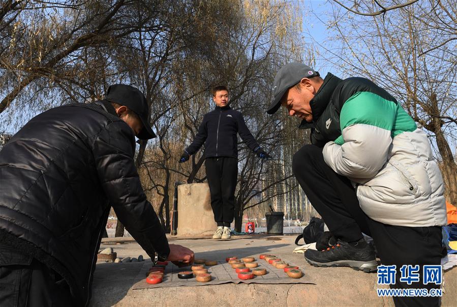 12月20日,冬泳愛好者張敏捷(中)冬泳后上岸跳繩暖身,張勝(右)結束冬泳后在一旁下棋。新華社記者陶希夷攝